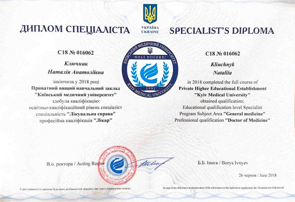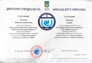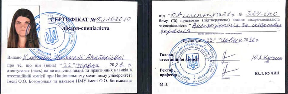 - 2025 р. — Національний медичний університет ім. О.О. Богомольця. Дитяча анастезіологія та терапія.