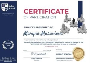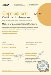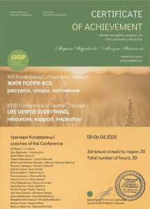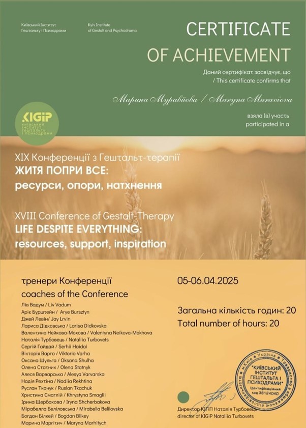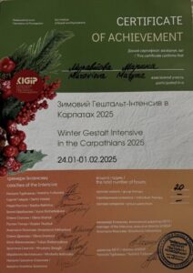 - 2024 – Київський Інститут Гештальту та Психодрами (КІГІП). Спеціалізація «Робота із сім’ями в гештальт-підході».