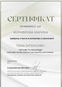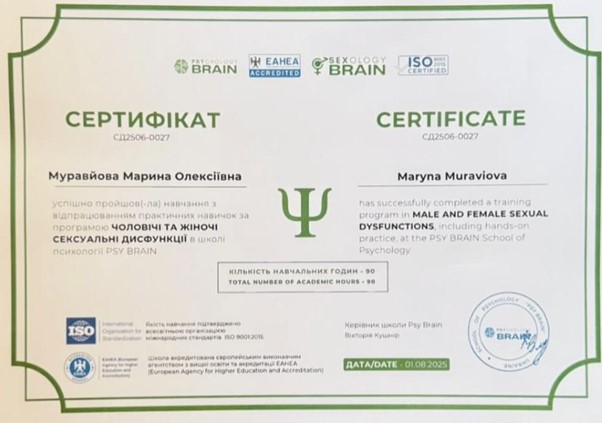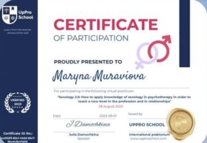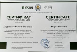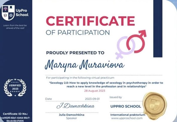 - 2024 – Школа психології Psy Brain на базі Університету Григорія Сковороди. Курс «Сексологія».