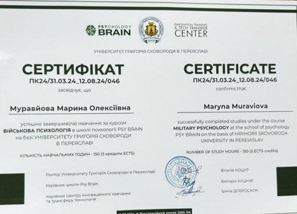- 2024 – Школа психології Psy Brain на базі Університету Григорія Сковороди. Курс «Військова психологія».