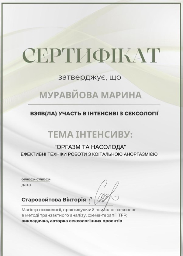 Муравйова Марина — магістр психології, психотерапевт, сімейний психолог, сексолог приватної психіатричної та наркологічної клініки «Петра і Павла» у м. Київ.