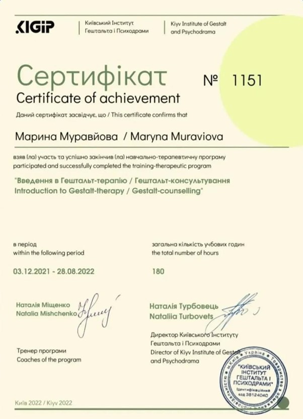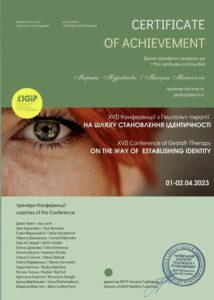 - 2021–2022 – КІГІП. Навчально-терапевтична програма «Введення в гештальт-терапію / гештальт-консультування» (1 ступінь).