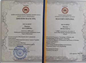 - 2021–2023 – Київський національний університет імені Тараса Шевченка. Магістр психології. Освітня програма «Психологія сім’ї з основами психотерапії».