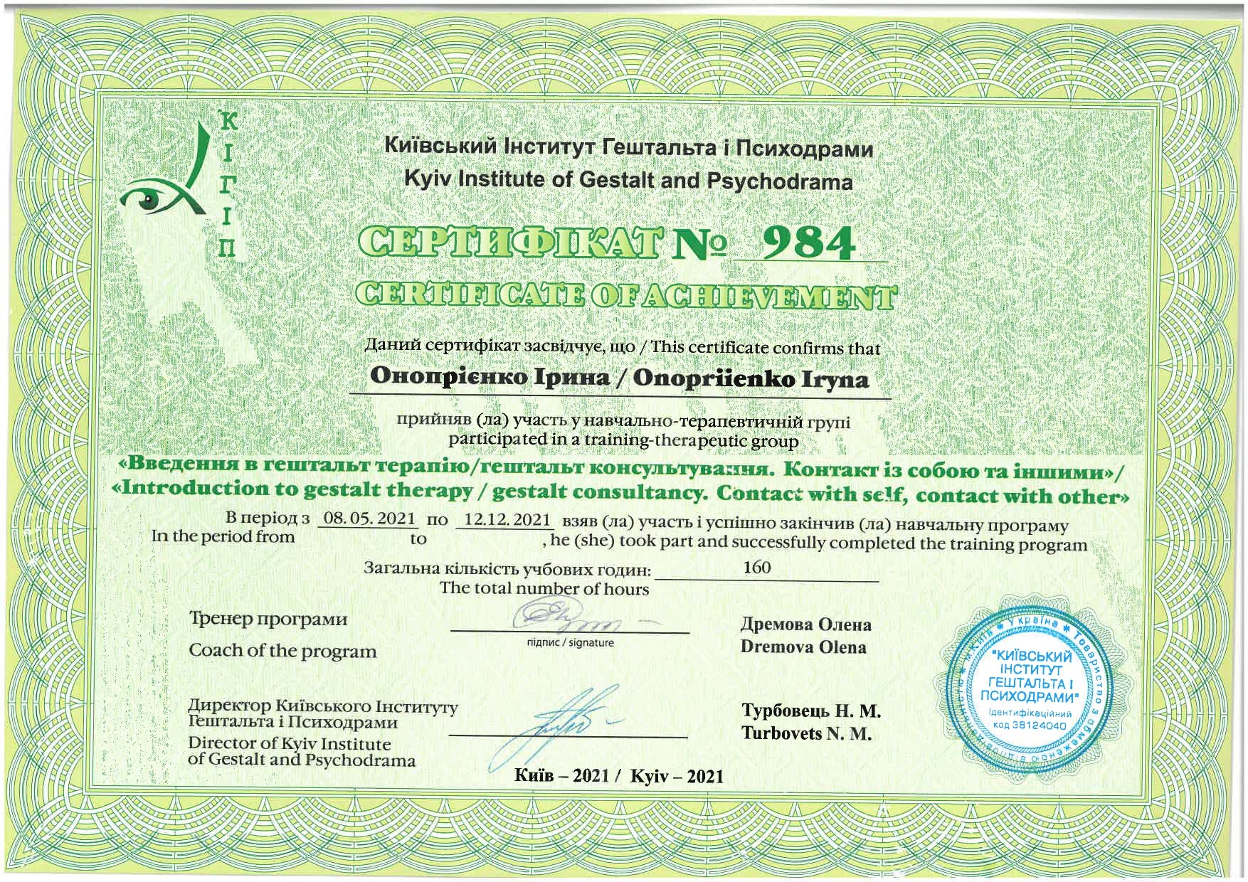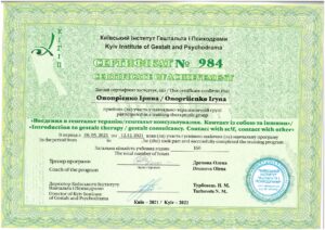 - 2021 г. — “Введення в гештальт-терапію | гештальт консультування. Контакт із собою та іншими”.