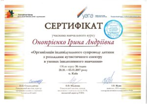 - 2018 г. — курс навчальної програми з підготовки спеціалістів з прикладного аналізу поведінки рівня BCaBA «Методи оцінювання та розвитку навичок у дітей із РАС»;