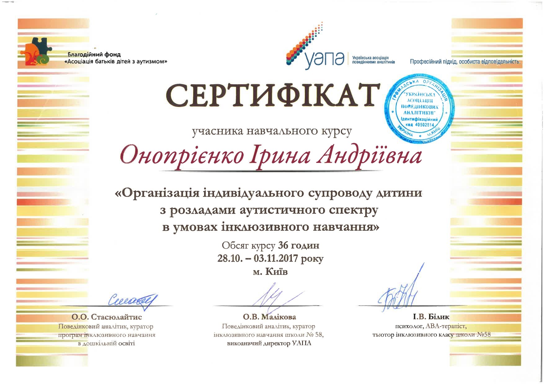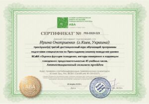- 2019 г. — курс навчальної програми з підготовки спеціалістів з прикладного аналізу поведінки рівня BCaBA «Оцінка функції поведінки, методи вимірювання та корекціі поведінки»;