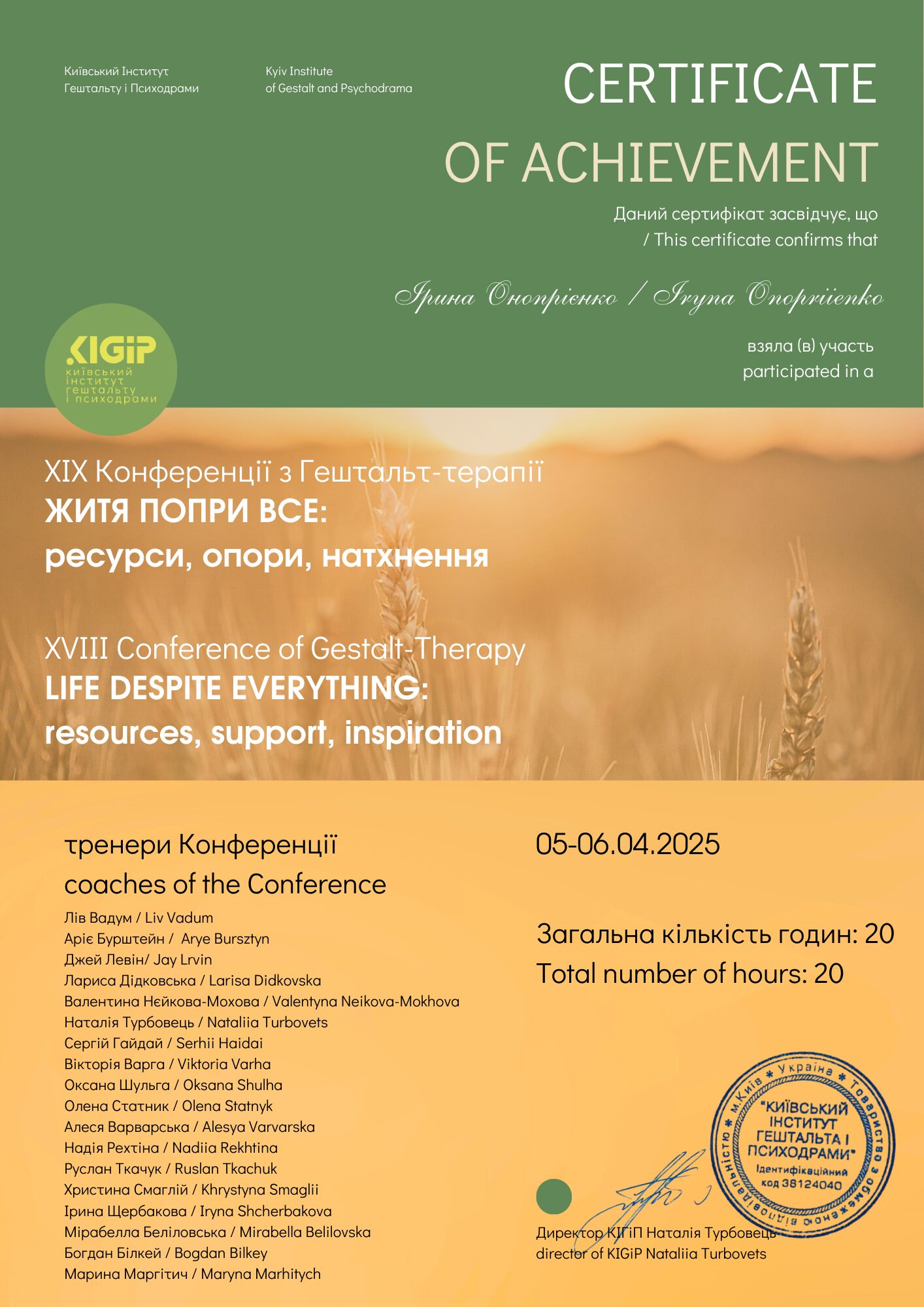 - 2025 г. — конференція з Гештальт-терапії «Життя попри все: ресурси, опори, натхнення»;