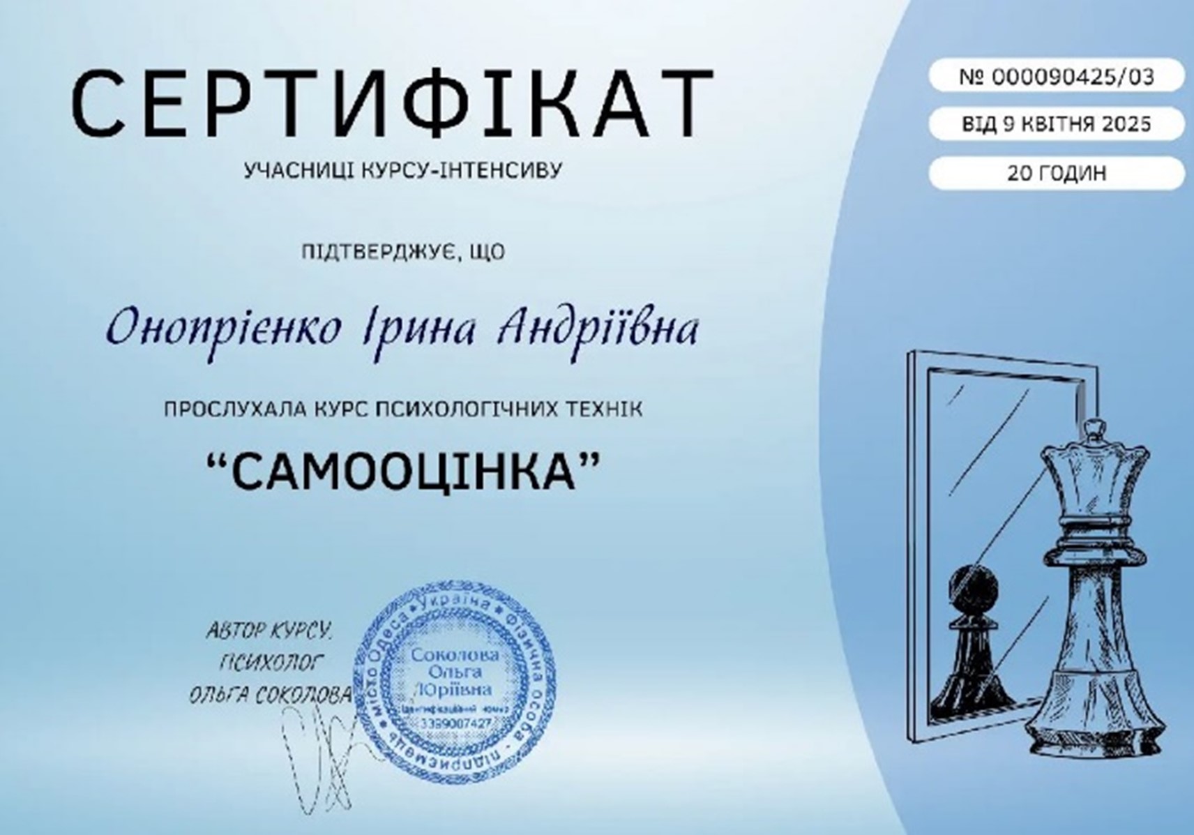 - 2025 г. — курс «Психологічних технік «Самооцінка», Ольга Соколова;
