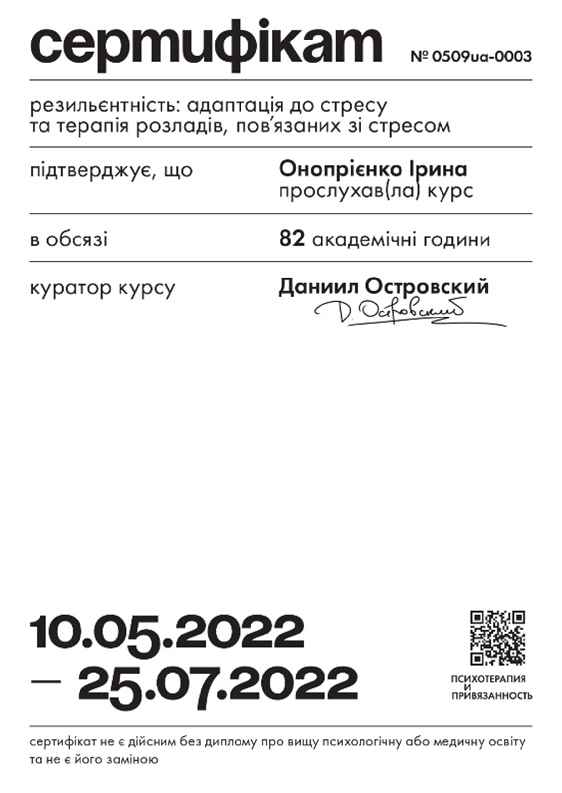 - 2022 г. — курс «Резильєнтність: адаптація до стресу та терапія розладів, пов’язаних зі стресом»;