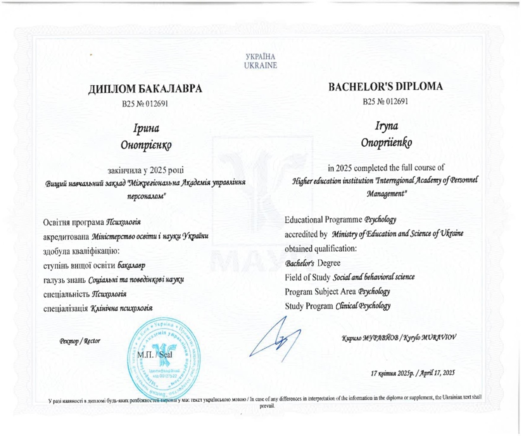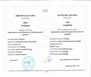 - 2025–2026 гг. — «Патопсихологічне обстеження дорослих», Міжнародний інститут психології;